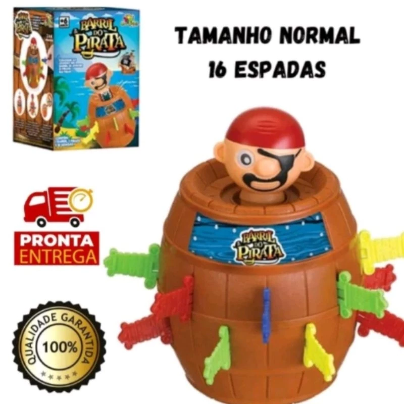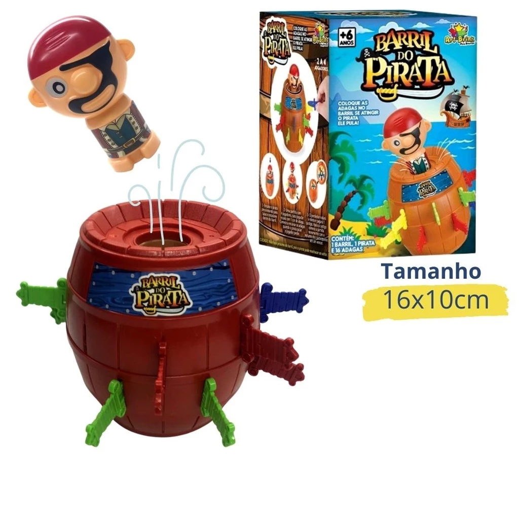Barril do Pirata: cada participante, na sua vez, coloca a espadinha no barril. Uma aqui, outra ali... E o clima de suspense fica no ar, pois ninguem sabe quando o pirata vai pular. Mas de repente, ao colocar mais uma espadinha, la vai ele, pulando para fora do barril.