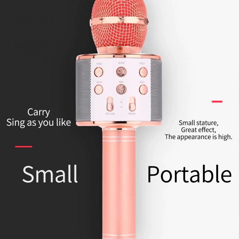 O microfone é relativamente pequeno e não ocupa muito espaço em sua bolsa. É muito portátil .A aparência adota o princípio da mecânica do corpo humano, seu punho é projetado razoavelmente, e sua aderência é mais confortável. A mão não terá sensação de dor quando usado por um longo tempo. Pode fazer conexões sem fio de bluetooth sobre longas distâncias. É muito prático e conveniente. Tem uma vasta gama de aplicações. É adequado para cantar, jogar, festas e entretenimento familiar.